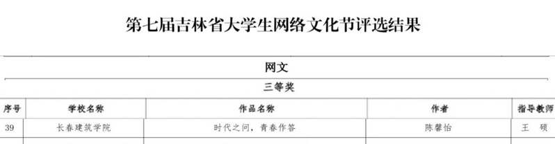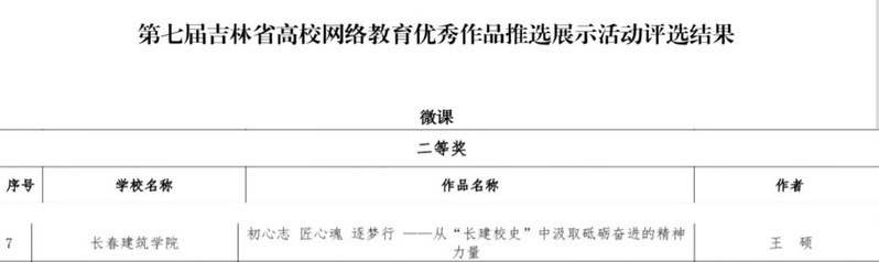 近日,根据吉林省教育厅下发的《关于公布第七届吉林省老员工网络文化节和高校网络教育优秀作品推选展示活动评选结果的通知》,公司共有11项作品获奖。其中公司王硕老师主讲的微课《初心智 匠心魂 逐梦行——从“长建校史”中汲取砥砺奋进的精神力量》获吉林省高校网络教育优秀作品推选展示活动二等奖,王硕老师指导的网文类作品《时代之问青春作答》荣获吉林省老员工网络文化节评选三等奖。